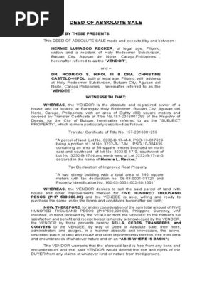 This deed of absolute sale is free to copy and revise for single use but not for re publication in print or in any other website. He might even show you the deed of absolute sale of the said property.
