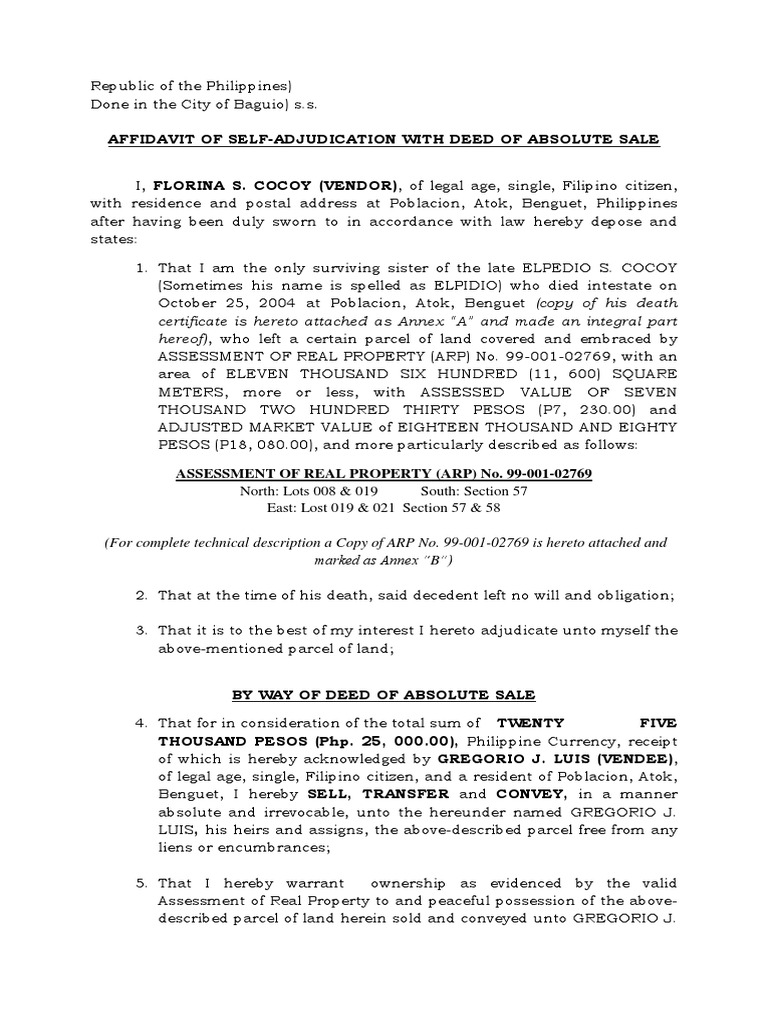 Adjudiocation With Deed Of Sale Cocoy Real Property Deed