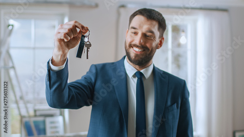 Successful Real Estate Agent In A Suit Smiles And Offers Keys From