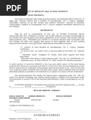 Deed Of Absolute Sale Of Real Property Real Property Deed